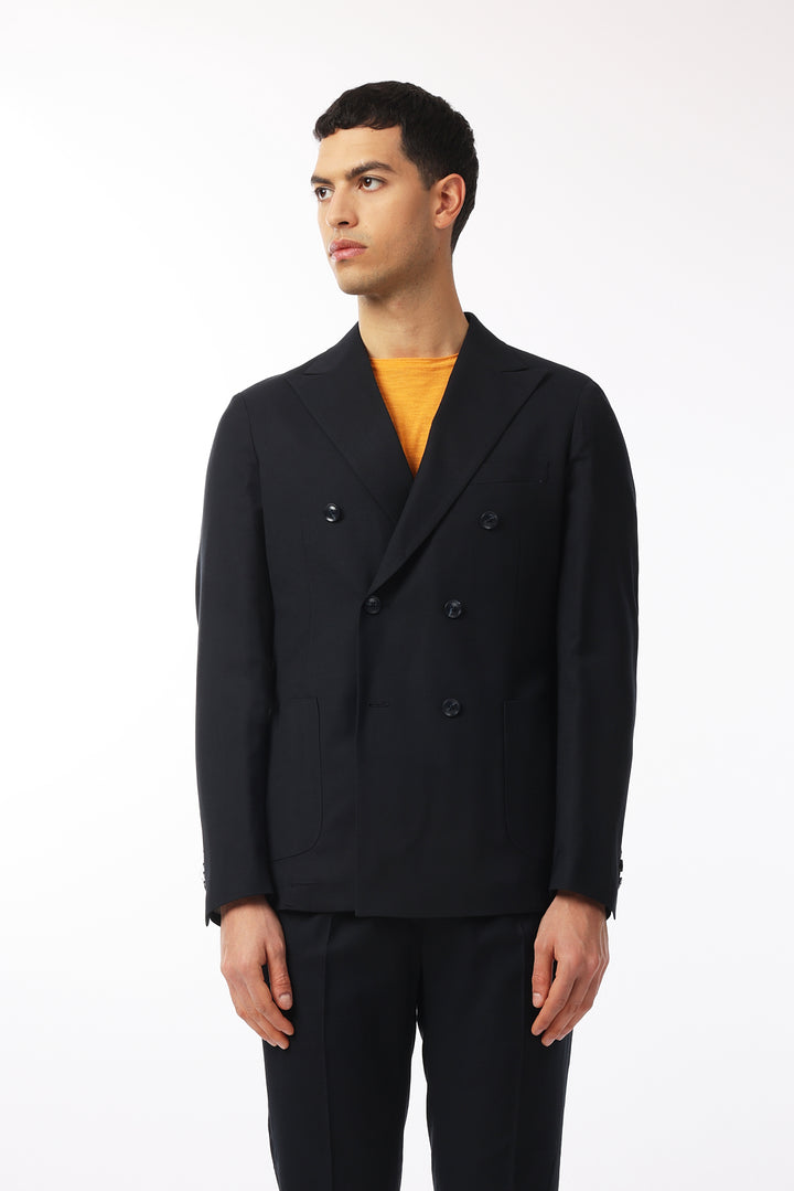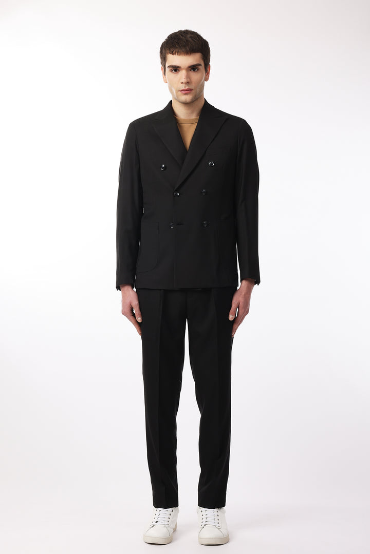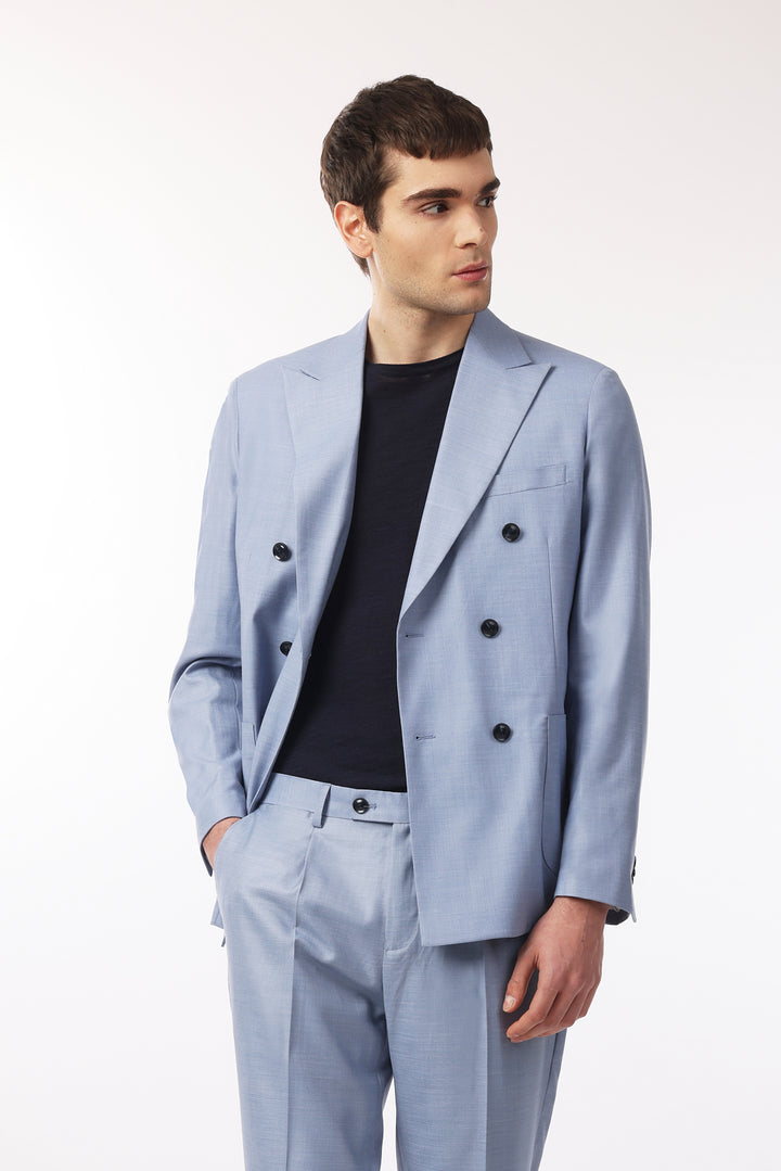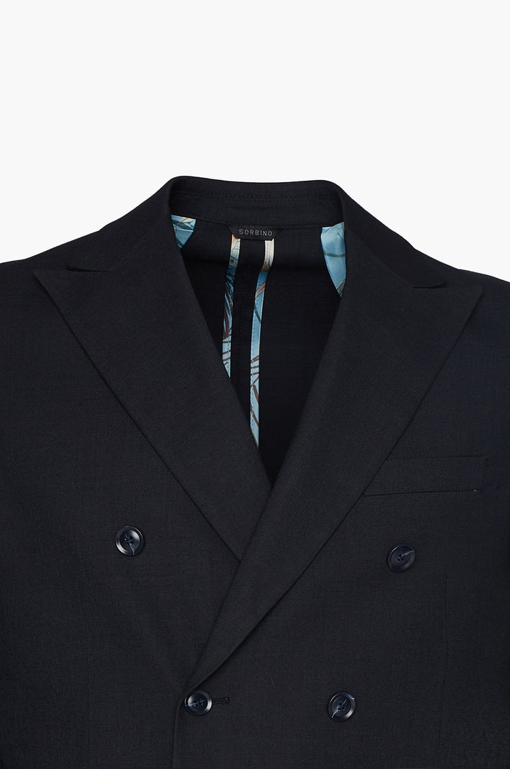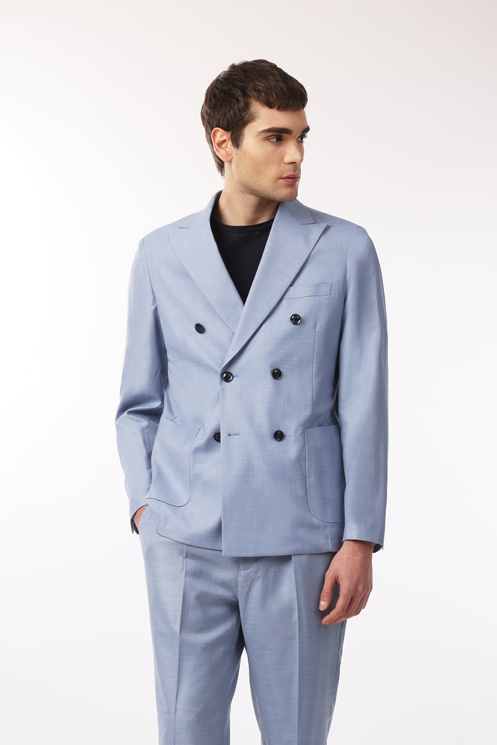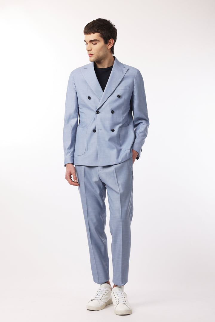 Abito classico, giacca doppio petto con tasche frontali e taschino sul petto. Revers classici.